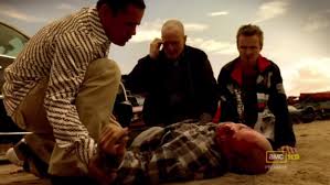 Speaking of reverberation, after the title sequence, we return to the end of Season One, relive the scene where Tuco beats the crap out of No-Doze after buying blue meth. If you notice early in the scene, Jesse’s hanging back more than Walt. And Walt still has some…I don’t know, the word that comes to mind is tenderness, to him. When Tuco brings No-Doze back and asks Walt to do CPR and Jesse to do mouth to mouth and Walt yells that No-Doze needs an ambulance, there’s just such humanity in Walt at that moment.