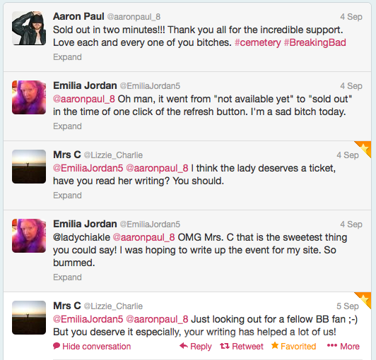 A stranger, someone from the UK who I connected with only via Twitter, told Aaron Paul that he should give me a ticket. This was right after I’d tried to get a ticket when they went onsale and failed. And, not to get all sappy but it really touched my heart, for real, that someone I didn’t know would say that. It somehow meant more that it wasn’t someone who was just saying that because they know me and my obsession for the show. It came as an absolute surprise, and I was touched.