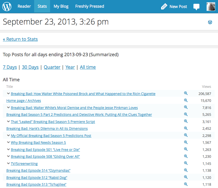I blog here, a lot, about Breaking Bad. My post How Walter White Poisoned Brock and What Happened to the Ricin Cigarette, which walks through the whole tangled web of lies Walt wove, step-by-step, with episode titles, pictures and detailed discussion to illuminate what happened and how Jesse finally figured it out, has helped more than TWO HUNDRED THOUSAND people (check it: photo evidence from my stats page) understand that plotline. One commenter even said, “This convoluted plot seems to be all crystal clear now about 99.1%. :) Thanks Chrys, I’m going to marry you!” This post has been linked at IMDB, televisionwithoutpity, a Radiohead forum, the Breaking Bad wiki, a bodybuilding forum, the AMC Breaking Bad site, TV Guide, and many, many other sites. Greg Otto linked it in his review of a Game of Thrones episode (it’s the “near-deaths” link) in US News and World Report.